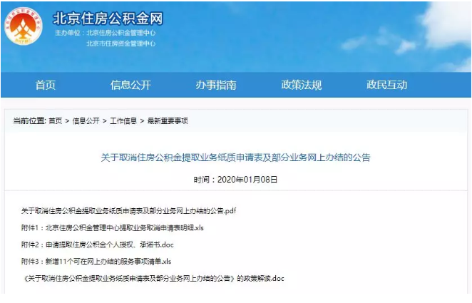 北京住房公积金管理中心于2020年1月8日发布《关于取消住房公积金提取业务纸质申请表及部分业务网上办结的公告》。